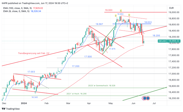 VDAX-New der Deutschen Börse (14. Juni 2024): Bei 17,65 (Vortag: 13,78%). Über 17% kaum stärkere Abwärtsbewegung.