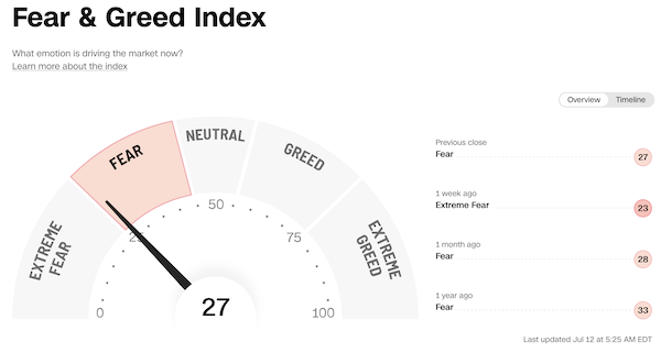 1. CNN Money's Fear & Greed Index (11. Juli 2022): Bei 27 (Vortag: 30) Punkten, Modus "Fear".