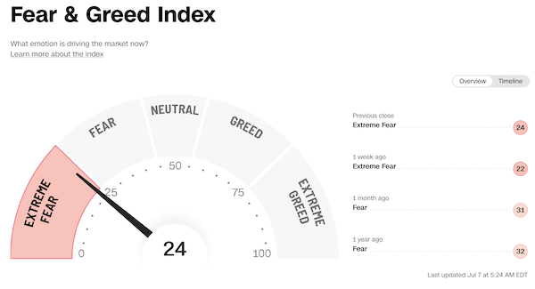 1. CNN Money's Fear & Greed Index (06. Juli 2022): Bei 24 (Vortag: 24) Punkten, Modus "Extreme Fear".