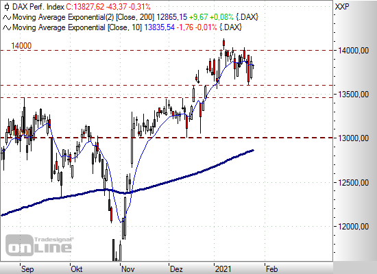 Aktuell tendiert der DAX übergeordnet noch seitwärts zwischen 14.000 Punkten auf der Oberseite und 13.600 Punkten auf der Unterseite. Erst bei einem nachhaltigen Durchbruch über bzw. unter eine dieser Marken wäre dann mit einem Ausbruch aus der Seitwärtsspanne zu rechnen.