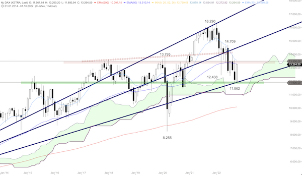 Damit dürfte der DAX weiter Kurs auf den 10er-EMA im Monatschart im Bereich von etwa 13.550 Punkten nehmen. Bereits bei den Erholungen der Vormonate lief der DAX in der Extension immer wieder den 10er-EMA im Monatschart an, bevor dann der übergeordnete Abwärtstrend wieder aufgenommen wurde. Trotz aller Stärke befindet sich der DAX bisher nur in einer Erholung und nicht in einem Trendwechsel von Short auf Long. Der DAX hat noch etwas Luft nach oben, könnte aber auch schon unter dem 10er-EMA im Monatschart wieder nach unten abdrehen.