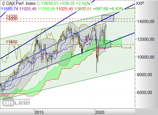 Gaps nach unten bei 13.596, 13.374, 12.600, 12.330, 11.391, 10.547, 10.097, 9.626 und 8.830 Punkten offen.