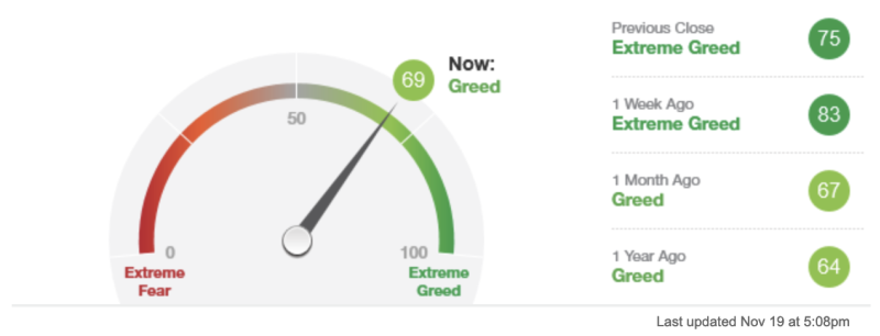 1. CNN Money's Fear & Greed Index (19. November 2021): Bei 69 (Vortag: 75) Punkten, Modus "Greed".
