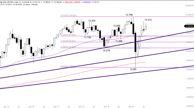 Eintrüben würde sich die Lage für den DAX mit einem Kursrutsch unter den 50er-EMA bei aktuell 12.560 Punkten. Dann wäre mit einem weiteren Rücklauf zum 200er-EMA bei 12.130 Punkten zu rechnen. Über 13.101 Punkten würde das vorherige Verlaufshoch hingegen überschritten werden und sich damit die Lage für den DAX deutlich aufhellen.