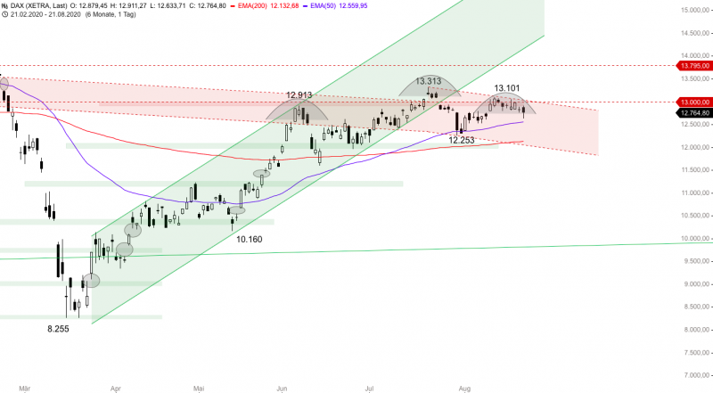 Anlaufmarken nach unten bei 12.900, 12.800, 12.700, 12.600 und 12.500 Punkten. Nach oben bei 13.000, 13.100, 13.300 und 13.500 Punkten.