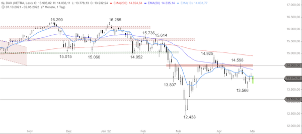 Anlaufmarken nach oben bei 14.000, 14.100, 14.180, 14.200, 14.400, 14.500 und 14.600 Punkten. Nach unten bei 13.900, 13.800, 13.700, 13.500 und 13.000 Punkten.