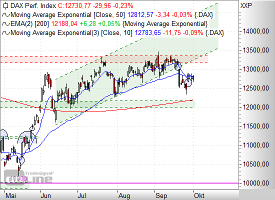 Anlaufmarken nach unten bei 12.700, 12.600, 12.500, 12.400 und 12.140 Punkten. Nach oben bei 12.800, 12.900, 13.000, 13.050 und 13.120 Punkten.