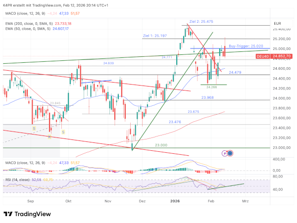 Auf der Oberseite bleibt die Marke von 25.020 Punkten entscheidend. Erst wenn der DAX diese Schwelle per Tagesschluss überwindet, rücken die Rekordstände bei 25.507 Punkten wieder in den Fokus. Derzeit deutet allerdings wenig auf ein solches Szenario hin.