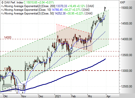 Am Vortag hieß es im Insight: "Und solange der DAX über dem 10er-EMA notiert, ist mit weiter steigenden Kursen zu rechnen. Bei einem nachhaltigen Ausbruch über 14.850 Punkte, wäre die runde Marke von 15.000 Punkten das nächste Anlaufziel." Die Marke von 15.000 Punkten wurde erreicht. Im Monatschart ist mit dem Durchbruch über die langjährige Widerstandslinie bei 14.100 Punkten ebenfalls ein langfristiges Stärkesignal generiert worden.