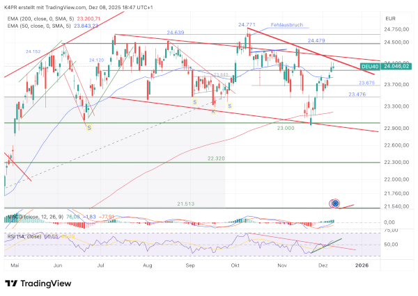 Kurzfristig bleibt Investoren daher nur die Option, das Handelsgeschehen von der Seitenlinie aus zu beobachten. Greifbare Kaufsignale können nach aktueller Auswertung erst oberhalb von 24.500 Punkten greifen und im Anschluss eine Rallye zurück an das Rekordhoch bei 24.771 Punkten auslösen, ein weiteres Ziel wurde bei 24.961 Punkten identifiziert. Auf der Unterseite müsste unterhalb von 23.950 Zählern mit einem Rückschritt auf 23.476 Punkte gerechnet werden. Wie die Indikatoren im Chart zeigen, ist der DAX technisch in einer gesunden Verfassung. Schlussendlich wird alles von der kurzfristigen Marktreaktion nach dem Fed-Zinsentscheid am Mittwoch abhängig gemacht.