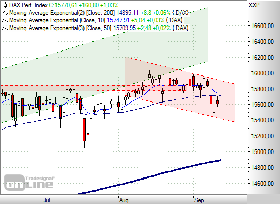 Aufwärtskorrekturen im Abwärtstrend laufen in der Regel im Bereich des 10er-EMA aus. Möglicherweise steuern die Bullen noch das offene Gap vom 07. September bei 15.826 Punkten an. Gaps werden in der Regel wieder geschlossen. In der Extension wäre mit einem weiteren Hochlauf zur oberen Begrenzung des fallenden Trendkanals im Tageschart zu rechnen.