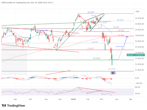 Aus technischer Sicht rückt nun der sogenannte 200-Tage-Durchschnitt in den Fokus, der aktuell bei 23.823 Punkten liegt. Damit der DAX dieses Niveau erreichen und den seit Anfang März bestehenden Abwärtstrend testen kann, wäre ein stabiler Schlusskurs über 23.200 Punkten notwendig.