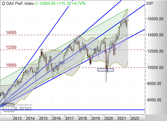 DAX unterm Fibonacci-Fächer im Monatschart bei 15.950/16.000 Punkten langfristig mit fallenden Kursen erwartet.