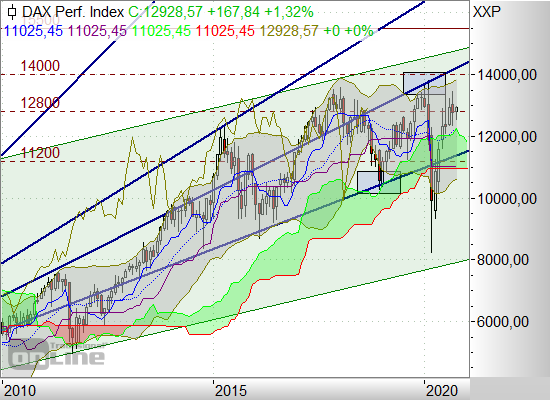 Gaps nach oben bei 13.500 und 13.116 Punkten, nach unten bei 12.690, 11.391, 10.547, 10.097, 9.626 und 8.830 Punkten offen.