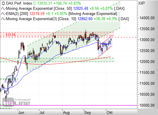 Eintrüben würde sich die Lage für den DAX erst wieder unter dem 50er-EMA. Dann würde der DAX wahrscheinlich direkt Kurs auf das noch untere offene Gap bei 12.690 Punkten als erste Anlaufmarke nehmen.
