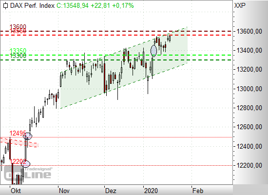 Anlaufmarken nach unten bei 13.500, 13.450, 13.400, 13.350 und 13.330 Punkten, nach oben bei 13.550 und 13.600 Punkten.