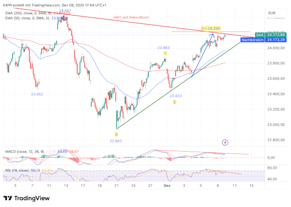 Damit es zu neuen Rekorden kommen kann, müsste der Index allerdings nachhaltig über 24.480 Punkte steigen. Dann wäre der Weg frei zum bisherigen Rekord bei 24.771 Punkten – und sogar ein Jahresendziel von rund 24.960 Punkten rückt in greifbare Nähe.