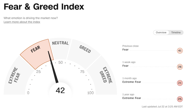 1. CNN Money's Fear & Greed Index (21. Juli 2022): Bei 42 (Vortag: 39) Punkten, Modus "Fear".
