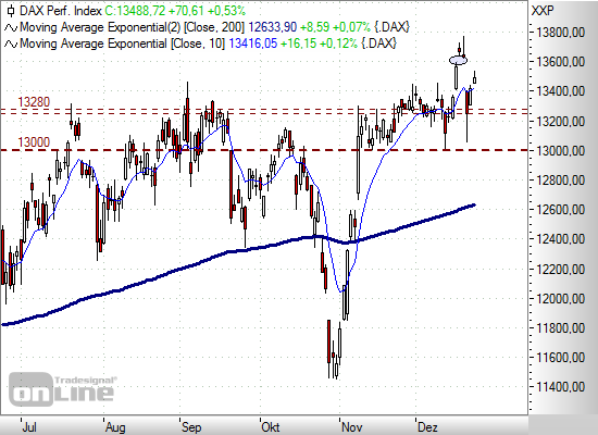 Anlaufmarken nach oben bei 13.700 und 13.800 Punkten. Nach unten bei 13.460, 13.400, 13.200, 13.060 und 13.000 Punkten.