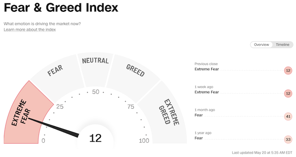 1. CNN Money's Fear & Greed Index (20. Mai 2022): Bei 9 (Vortag: 9) Punkten, Modus "Extreme Fear".