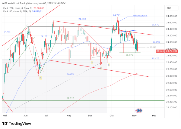 Anlaufmarken nach oben bei 24.000 / 24.350 / 24.479 und 24.639 Punkten, nach unten bei 23.675 / 23.601 / 23.476 und 23.383 Punkten.
