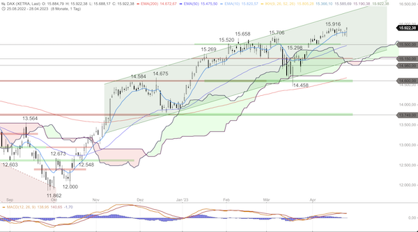 In der vorherigen Analyse hieß es: "Long-Positionen bieten sich weiterhin im Bereich um den 10er-EMA an. Und solange der 10er-EMA weitgehend verteidigt werden kann, sind weiter steigende Kurse zu erwarten. Über dem 10er-EMA ist eher mit einem weiteren Hochlauf bis in den Bereich von 16.000 Punkten zu rechnen." Der DAX ging bei 15.922 Punkten aus dem Handel und hat damit ein weiteres Verlaufshoch markiert. Nachbörslich zeigt sich der DAX bereits im Bereich von 15.960 Punkten. Die Long-Positionen bei 15.750 und 15.850 Punkten mit Kursziel um 16.000 Punkte könnten vor dem langen Wochenende verkauft werden.