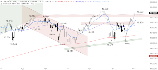 Anlaufmarken nach oben bei 16.090, 16.100 und 16.290 Punkten. Nach unten bei 16.000, 15.900, 15.800, 15.700, 15.650, 15.600, 15.550, 15.260 und 15.000 Punkten.