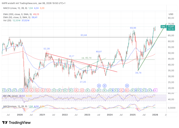 Unter hoher Volatilität entwickelt sich Delta Airlines seit nunmehr Ende 2022 gen Norden und erreichte bei 69,98 US-Dollar im Januar letzten Jahres ein frisches Rekordhoch. Zwar knickte der Wert nur wenig später um gut 50 Prozent auf 34,74 US-Dollar, konnte sich aber nur wenig später dynamisch erholen und im gestrigen Handelsverlauf ein Rekordhoch bei 73,16 US-Dollar markieren. Dies schürt nun die Hoffnung auf eine unmittelbare Rallyefortsetzung in den Bereich von zunächst 79,34, darüber auf 82,27 US-Dollar und bietet sich für ein kurzfristiges Engagement auf der Käuferseite an. Im Anschluss dürfte die Aktie aber wieder an ihre volatile Phase anknüpfen und in eine wohlverdiente Pause übergeben. Auffangpunkte findet Delta derzeit bei 68,50 und darunter 63,44 US-Dollar vor. In einem bärischen Szenario müssten sogar Abschläge auf 56,32 US-Dollar zwingend angenommen werden.