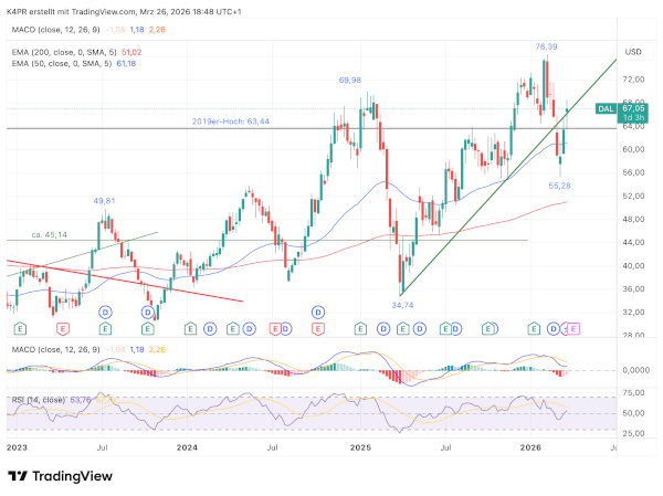 Auf der anderen Seite müsste die Aktie das bisherige Rekordhoch von 76,39 US-Dollar deutlich und möglichst auf Wochenschlussbasis überschreiten, um weiteres Aufwärtspotenzial bis 93,35 US-Dollar zu eröffnen. Noch ist die Richtung nicht eindeutig entschieden – umso wichtiger ist es für Anleger, die Entwicklung aufmerksam zu beobachten.