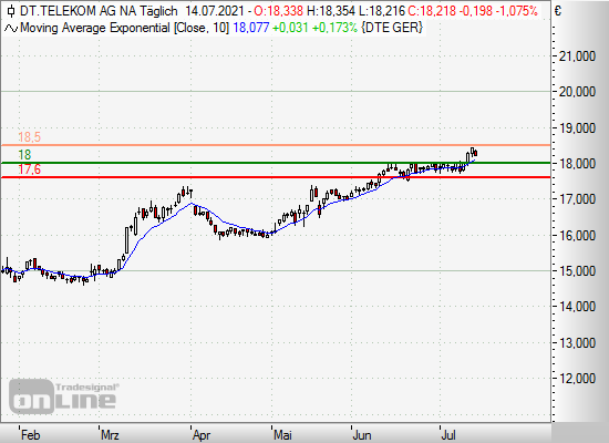 Eine neue Long-Position in Trendrichtung bietet sich nun im Bereich von 18,00 Euro leicht unterhalb des 10er-EMA an. Der Aufwärtstrend ist klar intakt, die nächste Zielmarke wäre im Bereich von 18,50 Euro zu sehen.