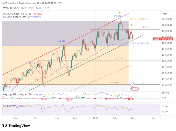 Ein entscheidender Bereich liegt zwischen 48.323 und 48.860 Punkten. Fällt der Index nachhaltig unter diese Zone, die als Verkaufssignal gilt, und unterschreitet zudem den EMA 50 sowie den bestehenden Aufwärtstrend, wäre das ein deutliches Zeichen für einen mittelfristigen Richtungswechsel. In diesem Fall könnten sich verstärkt Chancen auf der Verkäuferseite ergeben.