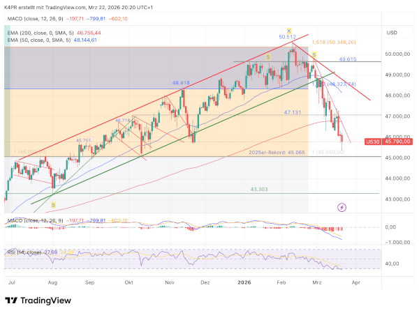 Zwischen Anfang Januar und Ende Februar bildete der Dow Jones eine sogenannte Schulter-Kopf-Schulter-Formation (kurz SKS), ein bekanntes Muster für eine mögliche Trendwende nach unten. Der tatsächliche Auslöser für den Kursrückgang kam dann mit der Eskalation des Konflikts mit dem Iran. Zunächst fiel der Index bis in den Bereich seines 200-Tage-Durchschnitts. In den letzten Stunden ging es sogar weiter nach unten – bis knapp an das frühere Rekordhoch aus dem Jahr 2025 bei 45.065 Punkten. Genau dieser Bereich gilt als wichtiges Kursziel aus der zuvor gebildeten Formation.