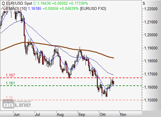 Die Short-Position im Bereich von 1,161 Dollar befindet sich weiterhin im Rennen. Der Stopp befindet sich bei 1,167 Dollar. Das Kursziel ist etwas unter dem Verlaufstief bei 1,150 Dollar zu sehen.