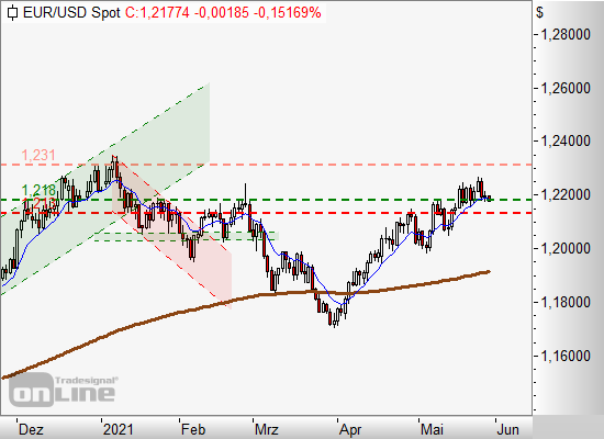 1. Long-Position im Bereich von 1,215 bis 1,218 Dollar am 10er-EMA eröffnet. Stopp bei 1,213 Dollar. Kursziel um 1,231 Dollar.