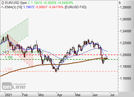 1. Short-Position im Bereich des 200er-EMA eröffnet. Stopp bei 1,200 Dollar. Kursziel im Bereich von 1,172 Dollar.
