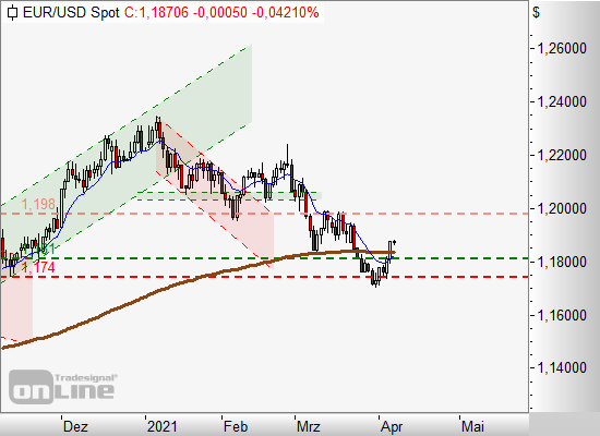1. Long-Position im Bereich von 1,181 Dollar am 10er-EMA möglich. Stopp bei 1,174 Dollar. Kursziel um 1,198 Dollar.