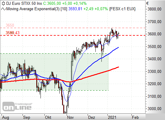 Am Vortag hieß es im Insight: "Achtung, es hat sich kurzfristig eine Kette von tieferen Hoch- und Tiefpunkten im Euro Stoxx 50 gebildet. Daher wäre ein nur kurzer Anstieg über den 10er-EMA, gefolgt von einem weiteren Rücklauf ein Schwächesignal. Im großen Bild sind die Aktienmärkte nach dem wochenlangen Hochlauf ebenfalls überkauft. Bisher ist aber noch mit einem Kursanstieg zu rechnen, der Stopp sollte dann aber schnell nachgezogen werden. "