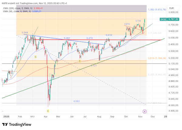 Nach dem erfolgreichen Sprung des EuroStoxx 50 über das Vorgängerhoch aus Anfang dieses Jahres bei 5.544 Punkten wurde ein zweites mittelfristiges Kursziel aktiviert, diesmal bei 5.932 Zählern und damit dem 138,2 % Fibonacci-Extension-Retracement. Die letzten Tage über waren aber noch von latenter Unsicherheit der Marktteilnehmer geprägt, Auslöser hierfür war der rekordverdächtig lange Shutdown in den USA. Eine temporäre Einigung im US-Haushaltsstreit bis Ende Januar hat aber den Knoten gelöst und den Märkten rund um den Erdball deutlichen Auftrieb verliehen. Ein Investment kann auch vom jetzigen Standpunkt aus erfolgen, ein passender Schein wird gleich im Anschluss vorgestellt. Auf der Unterseite dürfte es erst unter dem 50-Tage-Durchschnitt bei 5.583 Punkten zu signifikanten Rücksetzern in den Bereich von 5.467 Punkten kommen. Aber selbst bei einer derartigen Entwicklung bliebe der seit nunmehr Oktober 2022 andauernde Aufwärtstrend noch intakt.
