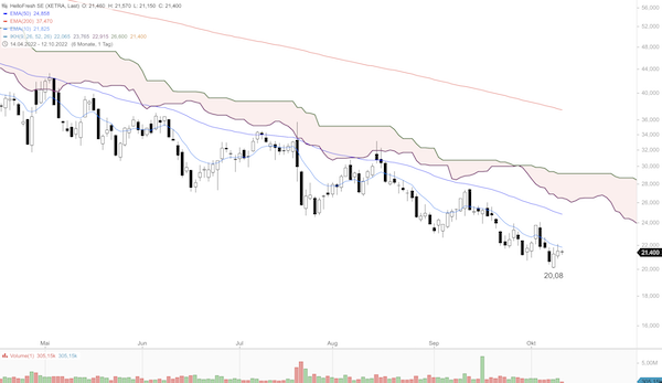 Solange die Aktien von HelloFresh unter dem 10er-EMA notieren, ist mit weiter fallenden Kursen zu rechnen. Die nächste Anlaufmarke wäre dabei das Verlaufstief bei 20,08 Euro, welches dem Abwärtstrend folgend unterschritten werden sollte. Am Vortag wurde bereits eine Short-Position im Bereich von 22,00/22,50 Euro eröffnet. Das Kursziel befindet sich bei 18 Euro.