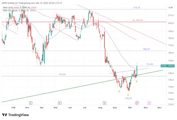 1. Long-Position auf aktuellem Niveau von 153,00 Euro eröffnen, Stopp unter 141,00 Euro platzieren. Kursziele 168,00/179,90 Euro