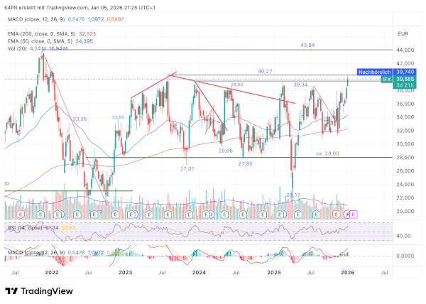 Infineon hat in den vergangenen Wochen bereits mehrere kleinere Hürden überwunden, die aus früheren Hochpunkten der Jahre 2024 und 2025 stammten. Nun rückt eine besonders wichtige Marke bei rund 40,00 Euro in den Fokus. Sollte die Aktie dieses Niveau nachhaltig überschreiten, könnten sich aus Sicht von Marktbeobachtern weitere Kurschancen eröffnen. In diesem Fall wären mittelfristig auch Kurse oberhalb von 43 Euro oder sogar in Richtung 46,00 Euro denkbar.