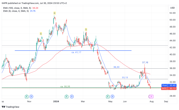 Technologietitel fliegen reihenweise aus den Depots der Anleger, dem kann sich die Intel-Aktie nach Auswertung der Kursmuster auch nicht entziehen und unterzieht die aktuellen Jahrestiefs bei 29,73 US-Dollar einem ausgiebigen Test. Sollte diese Unterstützung jedoch fallen, müsste neuerliche Rückschläge einkalkuliert werden, diesmal auf die Jahrestiefs aus 2022/2023 bei rund 25,00 US-Dollar. Entsprechend würde sich diese Entwicklung für den Aufbau von kurzfristigen Short-Positionen anbieten. Um die Intel-Aktie wieder ins bullische Fahrwasser zu manövrieren, bedarf es eines nachhaltigen Wochenschlusskurses oberhalb des 200-Wochen-Durchschnitts von 37,17 US-Dollar. Dies könnte dann Kursgewinne an 41,17 US-Dollar auslösen. Solange jedoch Technologietitel gemieden werden, bleibt ein derartiges Szenario derzeit nicht zu favorisieren.
