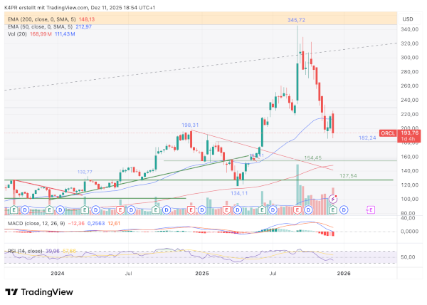 Noch Anfang September hatte Oracle ein neues Rekordhoch bei 345,72 US-Dollar markiert. Seitdem hat sich das Bild jedoch deutlich eingetrübt. Die Aktie rutschte zunächst in den Bereich um 225 US-Dollar, später weiter auf 185,63 US-Dollar, wo auch der 50-Wochen-Durchschnitt verlief.