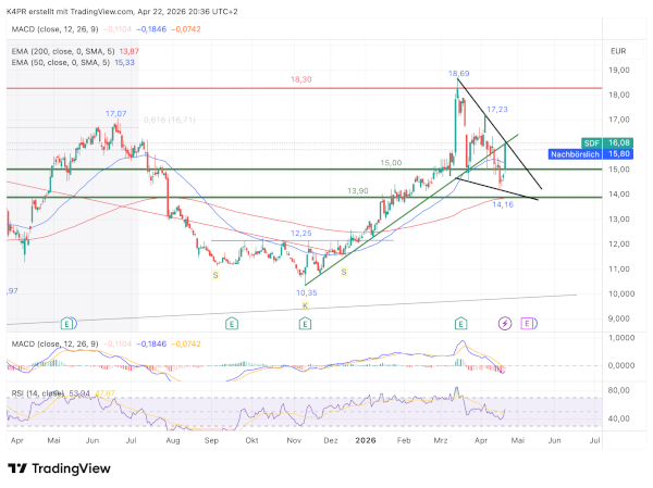 Trotz der jüngsten Kursgewinne befindet sich die Aktie technisch betrachtet noch in einer Korrekturphase, die auf die starke Rallye zwischen November 2025 und Anfang März folgt. Allerdings zeigen sich erste Anzeichen für eine mögliche Fortsetzung des Aufwärtstrends. Sollte der Kurs über 16,40 Euro steigen, wären weitere Gewinne in Richtung 17,23, 18,69 und im besten Fall sogar 20,50 Euro denkbar.