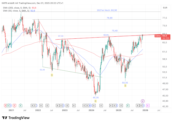 1. Long-Einstieg über dem Niveau von 70,40 Euro, Stopp unter 67,10 Euro platzieren. Kursziele 76,90 / 80,90 Euro