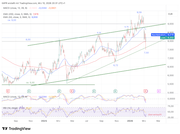 Zuvor war es der Lufthansa-Aktie gelungen, über die Marke von 9,00 Euro zu steigen und damit einen wichtigen Widerstand aus dem Sommer 2023 zu überwinden. Damit bestand die Chance, den seit Anfang 2025 bestehenden Aufwärtstrend nach oben zu verlassen und eine stärkere Kursrally zu starten. Durch die Zuspitzung des Nahostkonflikts rutschten jedoch viele Aktienmärkte deutlich ins Minus. In der Folge fiel auch die Lufthansa-Aktie wieder zurück – bis zum 200-Wochen-Durchschnitt bei rund 7,58 Euro sowie zu einem Aufwärtstrend, der bereits im April des vergangenen Jahres entstanden war.
