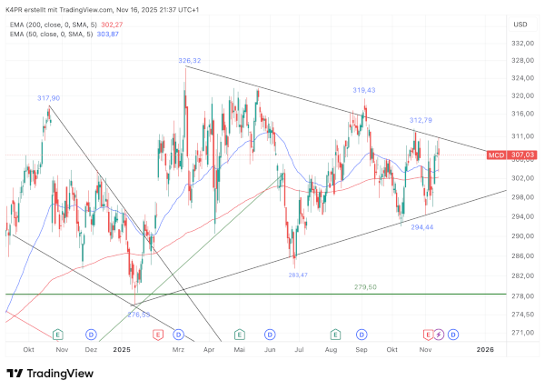 Aus technischer Sicht ist die aktuelle Marktlage bei McDonald’s vorläufig als neutral zu bewerten, solange sich die Aktie innerhalb des symmetrischen Keils aufhält. Mehrere Vorstöße an der oberen Begrenzung sind zuletzt erfolglos geblieben, dennoch würde sich bei einem Sprung über das Niveau von 313,00 US-Dollar ein erster Hinweis auf einen bevorstehenden Ausbruch und folglich ein Kaufsignal in Richtung 326,32 US-Dollar und mittelfristig 354,43 US-Dollar ergeben, sodass schon mal eine Positionierung beim Broker vorgenommen werden kann. Auf der Unterseite wird die Aktie um 294,44 US-Dollar (steigend) begrenzt, im Falle einer Auflösung zur Unterseite würde sich ein bärisches Signal mit einem vorläufigen Ziel bei 279,50 US-Dollar ergeben. Die Charttechnik weist aber auf eine Auflösung zur Oberseite hin, solange sich die Aktie im beschriebenen Keil aufhält.