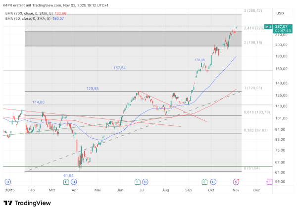 US-Technologiewerte sind augenscheinlich außer Rand und Band geraten und markieren nahezu alltäglich neue Bestmarken. Hierzu kann sich auch das Wertpapier von Micron Technology einreihen und stieg zu Beginn dieser Woche auf ein frisches Rekordhoch bei 237,62 US-Dollar, womit das dritte große Kursziel, bestehend aus dem 241,4 % Fibonacci-Extension-Retracement, mit Leichtigkeit überwunden werden konnte. Dies eröffnet auf Sicht der nächsten Tage weiteres Kurspotenzial auf nun 266,47 US-Dollar und würde sich für ein Long-Engagement noch anbieten. Dennoch sollte die Gefahr von scharfen Rücksetzern nicht gänzlich außer Acht gelassen werden, bestehende Positionen sind nun durch eine merkliche Stopp-Anhebung im Vergleich zur letzten technischen Besprechung vom 1. Oktober 2025 vorzunehmen. Auf der Unterseite dürfte die Aktie aus technischer Sicht erst unterhalb von 214,23 US-Dollar in eine längere Konsolidierung mit Zielen bei 198,38 und darunter im Bereich von 184,44 US-Dollar übergehen. Solange die Musik also spielt, sollte man hierzu auch tanzen.