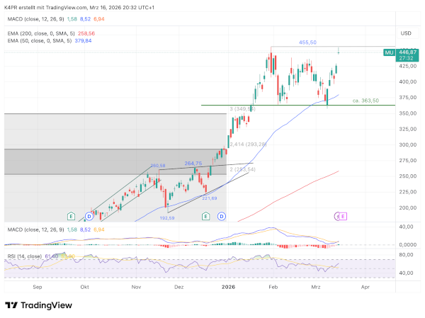 Charttechnisch versucht die Aktie derzeit, aus einer Rechteckkonsolidierung nach oben auszubrechen. Entscheidend ist dabei das bisherige Rekordhoch vom 2. Februar bei 455,50 US-Dollar. Sollte es gelingen, diese Marke nachhaltig zu überwinden, könnte dies ein weiteres Kaufsignal auslösen.