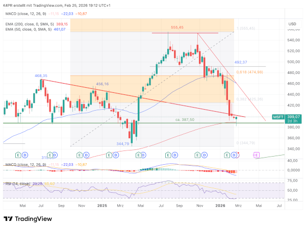 Der bereits zuvor hervorgehobene Unterstützungsbereich bei 387,50 US-Dollar – in Kombination mit dem 200-Wochen-Durchschnitt auf ähnlichem Niveau – zeigt erste Wirkung. Der starke Abverkauf hat sich dort merklich abgeschwächt. Stabilisiert sich die Aktie weiter und steigt über 400,00 US-Dollar, rücken zunächst die Kursziele bei 411,69 US-Dollar und darüber 425,00 US-Dollar in den Fokus. Das wären aus heutiger Sicht attraktive Marken für Anleger, die auf weiter steigende Kurse setzen.